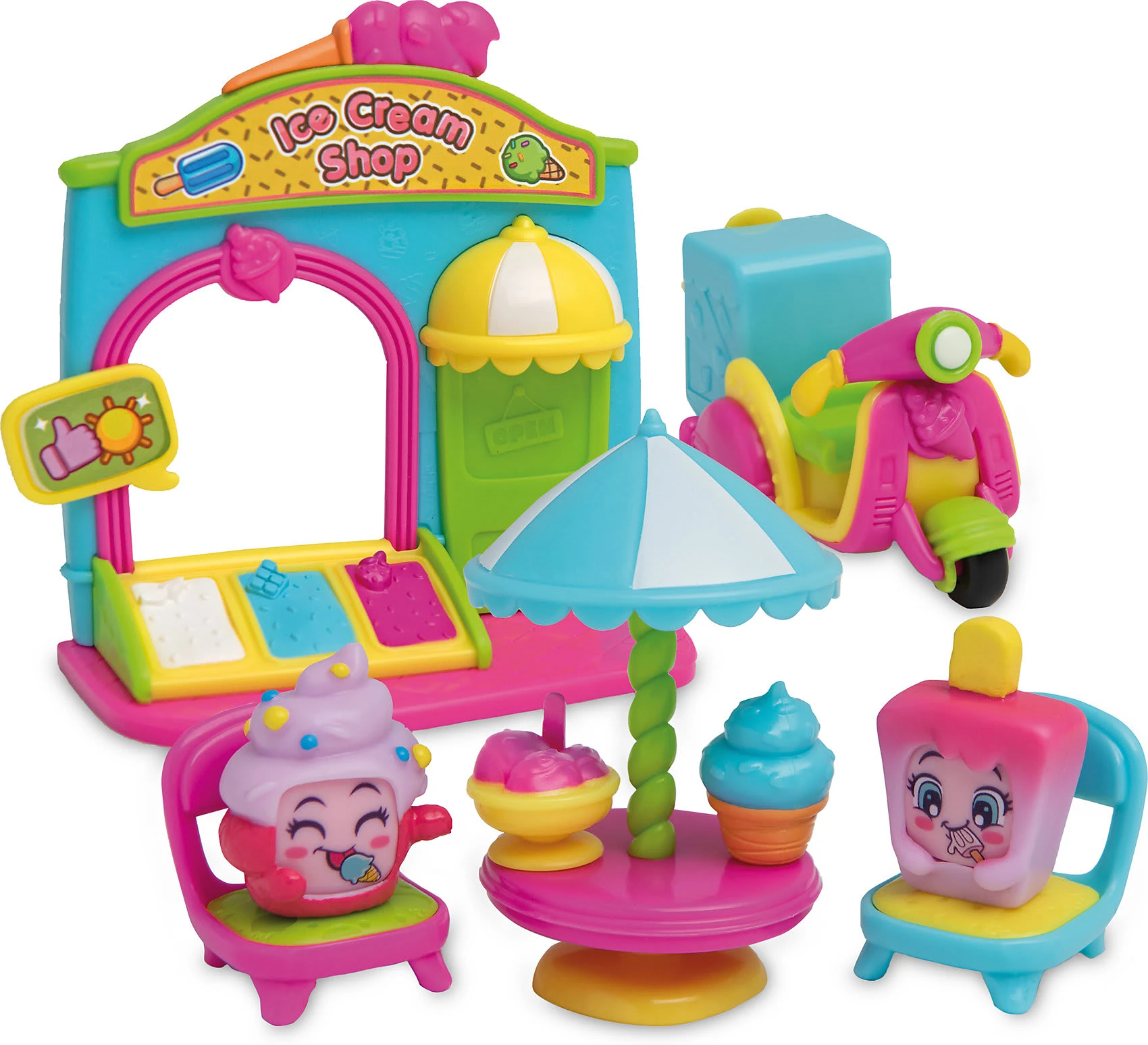Die niedlichen „MojiPops“ sorgen bei Kindern für so viel Begeisterung! Die Stimmung der tollen Figuren lässt sich im Handumdrehen ändern, indem einfach die Gesichter ausgetauscht werden. Mit dem umfangreichen „I Like Cream“ Spiel-Set von ASS werden Kinder zu vielen lustigen und spannenden Geschichten inspiriert, die sie dann mit den Figuren nachspielen können. Dank der wechselbaren Gesichter kann die Stimmung der „MojiPops“ optimal an verschiedene Situationen angepasst werden. Das tolle „I Like Cream“-Set beinhaltet eine Eisdiele, bei der die Figuren sich eine leckere Sorte holen können und Möbel auf denen die MojiPops es sich gemütlich machen können. Zudem kann mit dem Motorrad Eis geliefert werden.