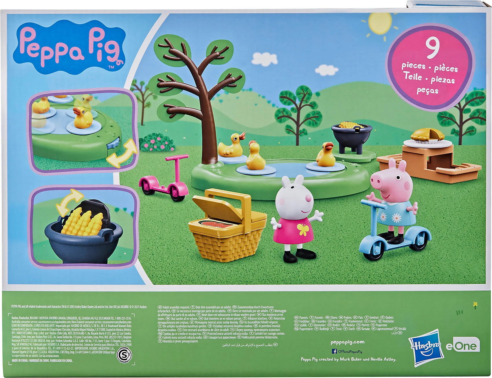 Aus der Serie Peppas Adventures von Hasbro kommt hier das Picknick mit Peppas Spielset. Peppa und ihre Freundin Luzie machen einen Ausflug und können dabei grillen oder leckeren Kuchen essen. Der Teich enhält niedliche Enten, die beim Drehen am Rädchen sogar schwimmen!