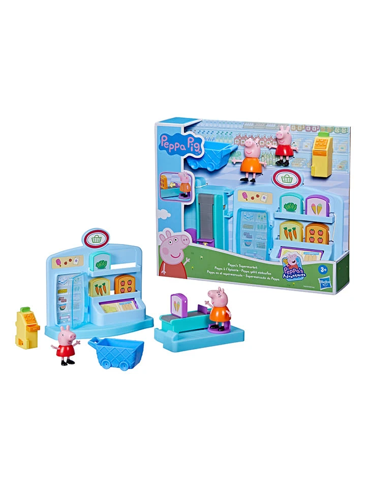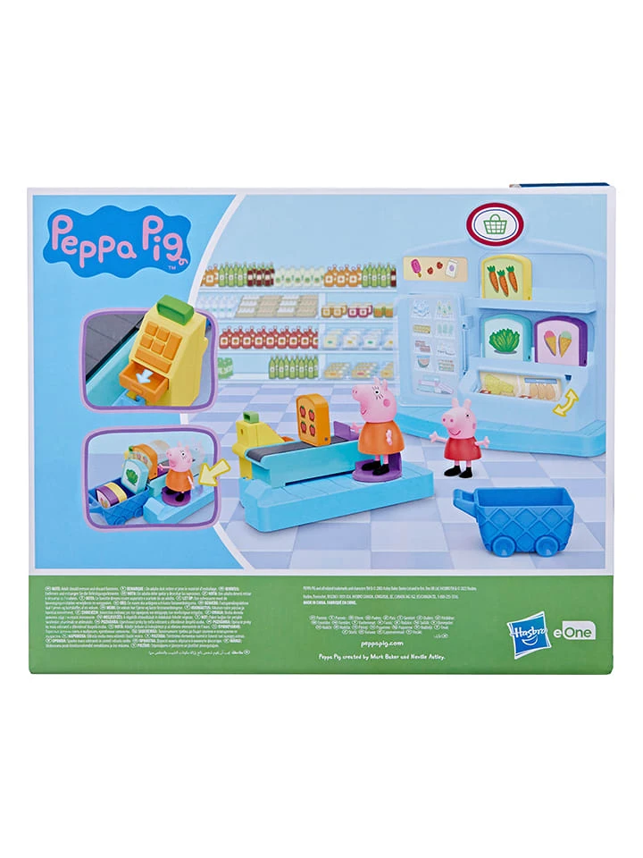 – Inhalt: 2 Spielfiguren, Einkaufswagen, Lebensmittel, Kühltruhe, Kasse mit Fließband