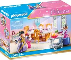 Märchenhafte Abenteuer und zauberhafte Geschichten können sich Kinder mit diesem tollen PLAYMOBIL® Spielset (70455) ausdenken! Der Speisesaal ist der wichtigste Raum im königlichen Schloss, schließlich finden hier immer die besonders wichtigen Feste statt. Dafür wird der Tisch mit dem edelsten Besteck und wunderschönem Geschirr eingedeckt. Das Set besteht unter anderem aus zwei Spielfiguren mit abnehmbaren Röcken, Möbelstücken sowie tollen Zubehörteilen.