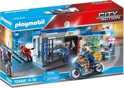 Heute ist es ruhig in der Polizeistation. Doch der Schein trügt. Plötzlich dringen merkwürdige Geräusche aus der Gefängniszelle. Der Gefangene hat sich durch das Gitterfenster abgesetzt. Schnell greift die Polizistin zum Funkgerät und informiert ihren Kollegen. Sofort nimmt der Polizist auf dem Motorrad die Verfolgung auf. Schon nach kurzer Zeit wird der Gauner dingfest gemacht und in Handschellen zurück in seine Zelle gebracht. Jetzt genehmigen sich die Polizisten erst einmal eine Tasse Kaffee. Das Spielset enthält drei PLAYMOBIL-Figuren, eine Polizeistation mit Gefängniszelle und Vorraum mit Arbeitsplatz, Regalen und Espressomaschine, ein Polizeimotorrad sowie viele weitere Extras für spannende Polizei-Action.