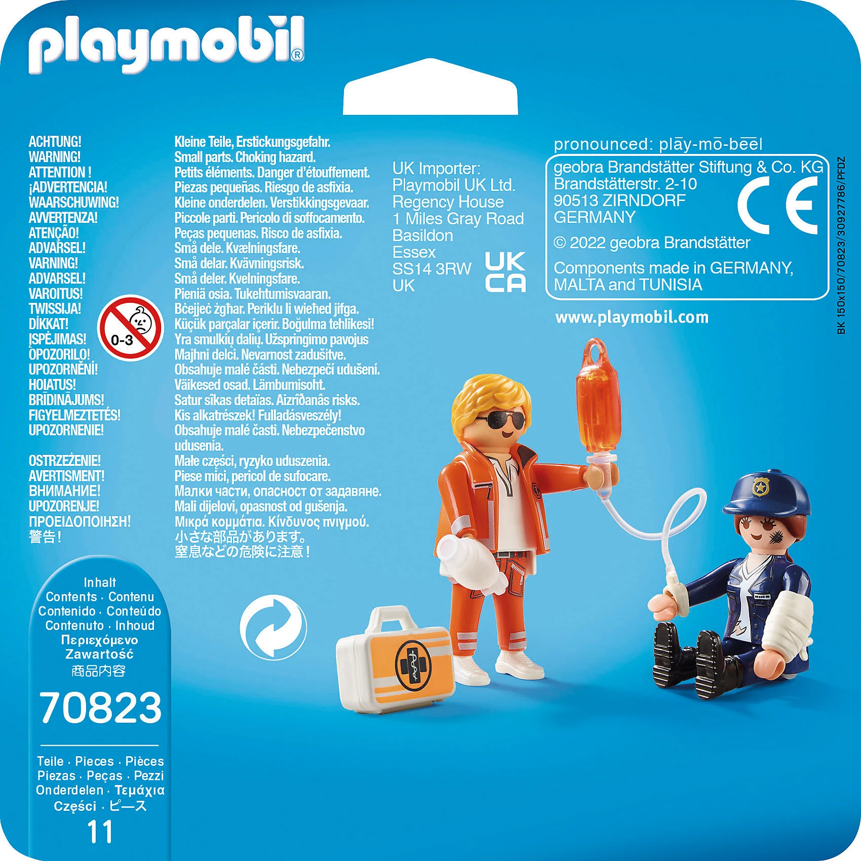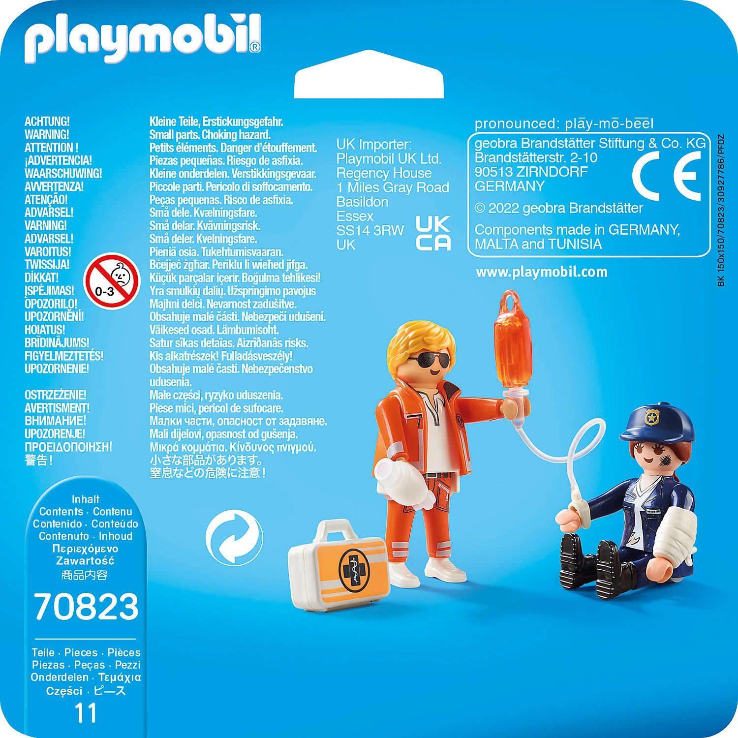 Oh nein! Bei der Verfolgungsjagd durch den Park wurde die Polizistin verletzt. Jetzt braucht sie selbst Hilfe. Mit dem Spieleset PLAYMOBIL® DuoPack Notarzt und Polizistin (70823) eilt der Notarzt herbei und ist mit seinem Erste-Hilfe-Koffer zur Stelle. Er versorgt die ramponierte Polizistin mit einem Verband und legt ihr eine Infusion, um den Kreislauf zu stabilisieren. Muss sie ins Krankenhaus? In dem Set enthalten sind zwei komplett ausgestattete Spielefiguren mit Zubehörteilen, wie für das Erzählen und Erfinden kreativer Geschichten.