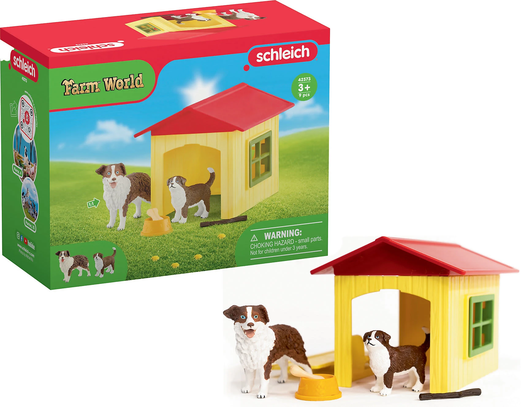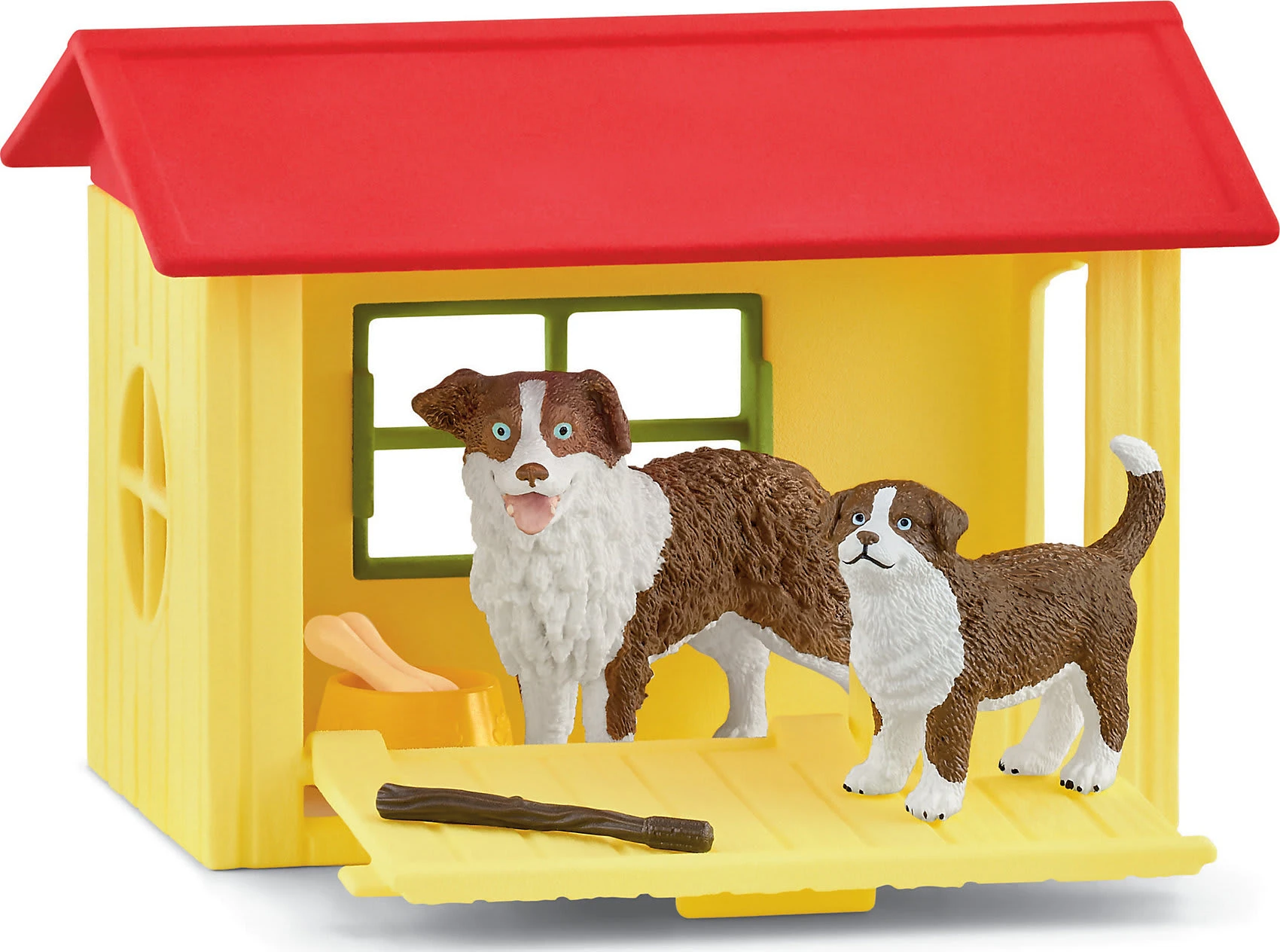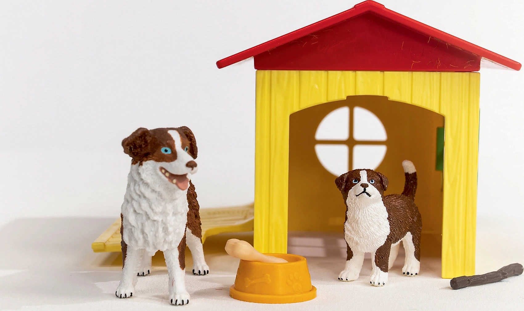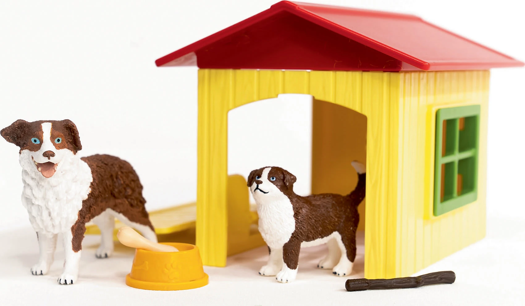Oh, sieh nur, da sind die Australian-Shepherd-Mama und ihr Welpe! Nachdem sie die Schafe der Farm eingefangen haben, freuen sich die hart arbeitenden Hütehunde auf ein schönes Nickerchen in der kunterbunten Hundehütte. Das Schleich Farm World Spielset 42573 Hundehütte enthält die zwei Hundefiguren und ihre Hütte sowie einen Spielzeugknochen, einen Napf und einen Stock für den Welpen zum Herumtollen und Knabbern. Ob Sonnenschein oder Regenwetter – die Hundehütte bietet immer ein gemütliches Plätzchen!